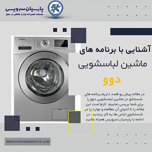 ما در این مقاله تلاش کردیم در مورد برنامه های ماشین لباسشویی دوو با شما صحبت کنیم. لازم است برای اینکه به طور کامل و اختصاصی با برنامه های ماشین لباسشویی خود آشنا شوید ابتدا به سراغ دفترچه راهنمای ماشین لباسشویی دوو بروید. لازم به ذکر است در صورت هرگونه مشکل در ماشین لباسشویی به طور حتم نیاز است با متخصصین ما در پارسیان سرویس تماس بگیرید. شماره های تماس ما برای رزرو خدمات در آخر مقاله برای شما قرار گرفته است.